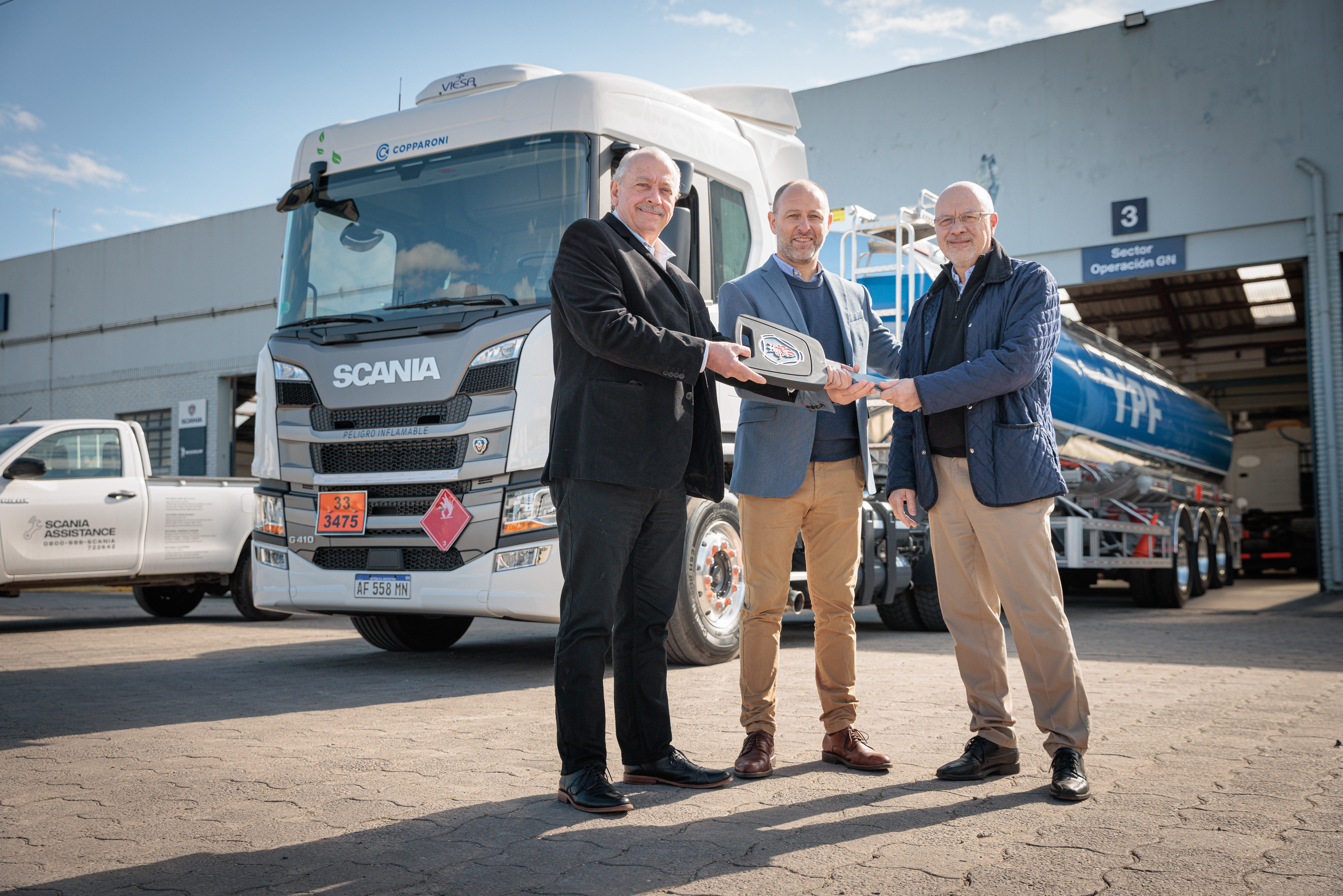 BUENOS AIRES, ARGENTINA, OCTUBRE DE 2022 – Scania Argentina gestionó, junto a YPF y Copparoni SA, las autorizaciones necesarias para que un camión impulsado a GNC pueda operar en las refinerías y distribuir combustible en las estaciones de servicio de la petrolera estatal. Tras un extenso proceso, el modelo G410 6x2 de la línea Green Efficiency se convirtió en la primera unidad a GNC en prestar servicio para el segmento de Cargas Peligrosas.