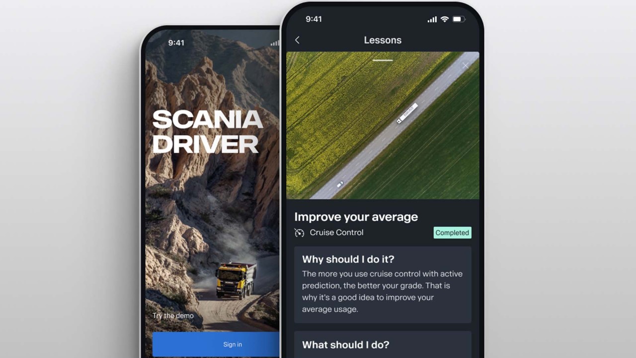 De Scania Driver-app is de omgeving voor chauffeurs die hun vaardigheden willen ontwikkelen. Lessen worden in de app weergegeven als filmpjes, tekst, afbeeldingen of audio, evenals missies. My Scania is de omgeving waar wagenparkbeheerders de voortgang van de chauffeurs kunnen volgen.