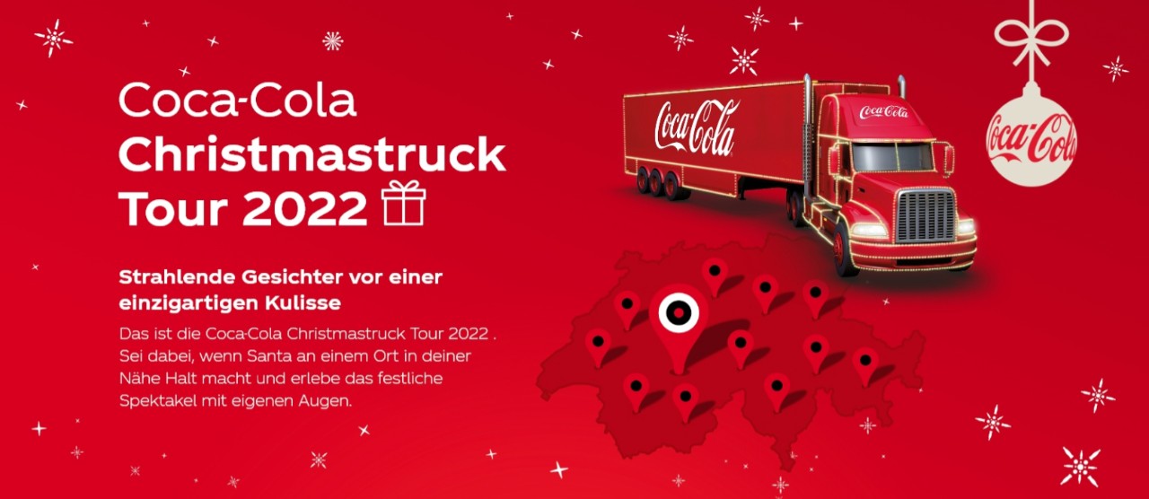 Am 24. November 2022 startet die diesjährige Coca-Cola Christmas Truck Tour beim Zürich Bürkliplatz und endet am Freitag 23. Dezember 2022 im Migros Shoppyland in Urtenen-Schönbühl. An insgesamt 20 Standorten kann die Tour besucht werden, ob gross oder klein, alle sind herzlich willkommen.