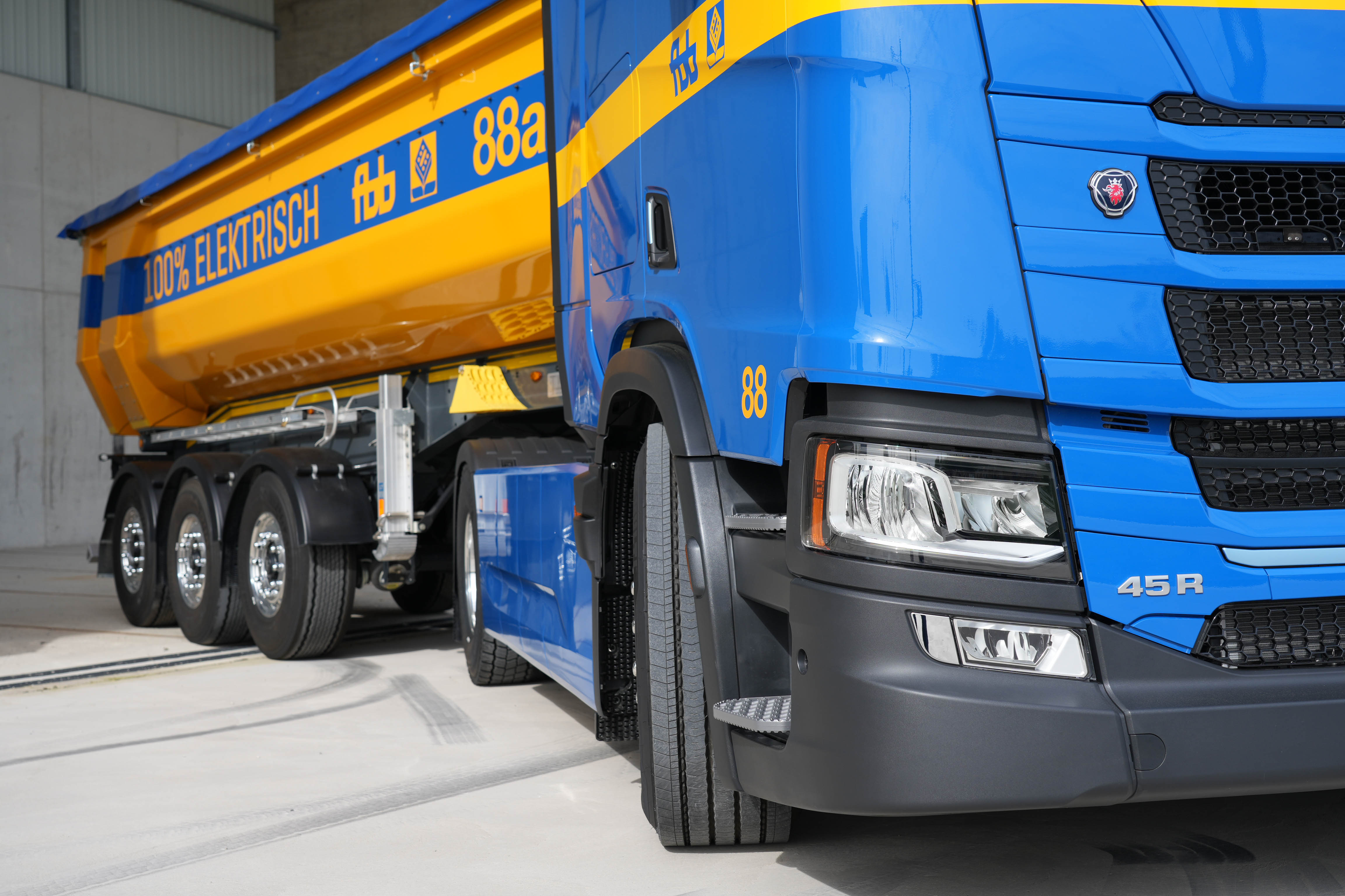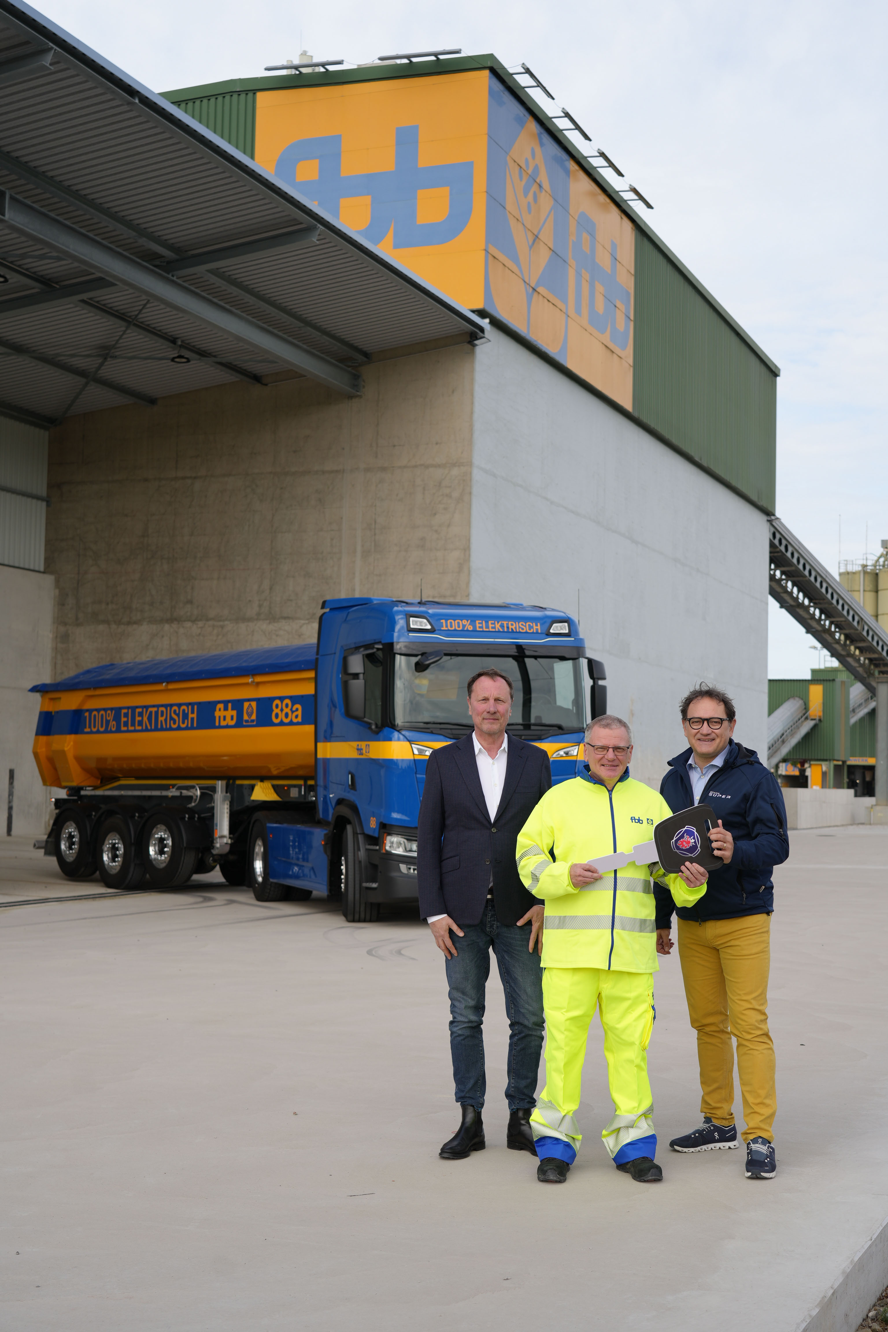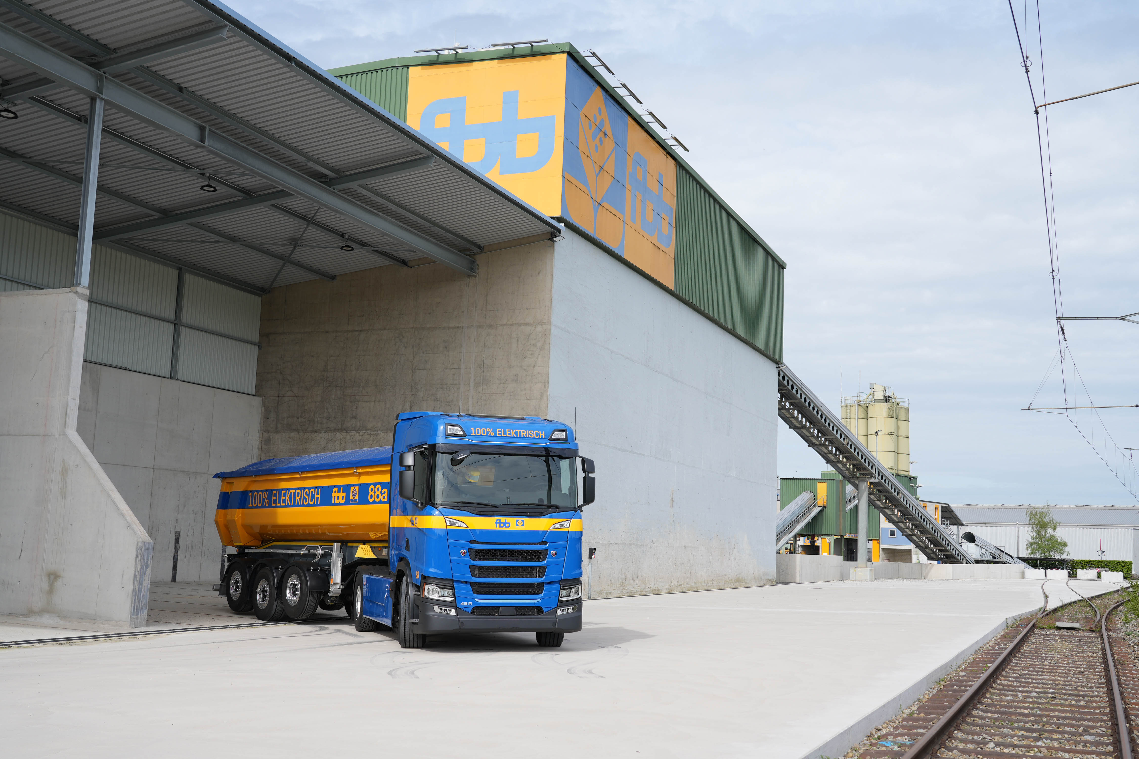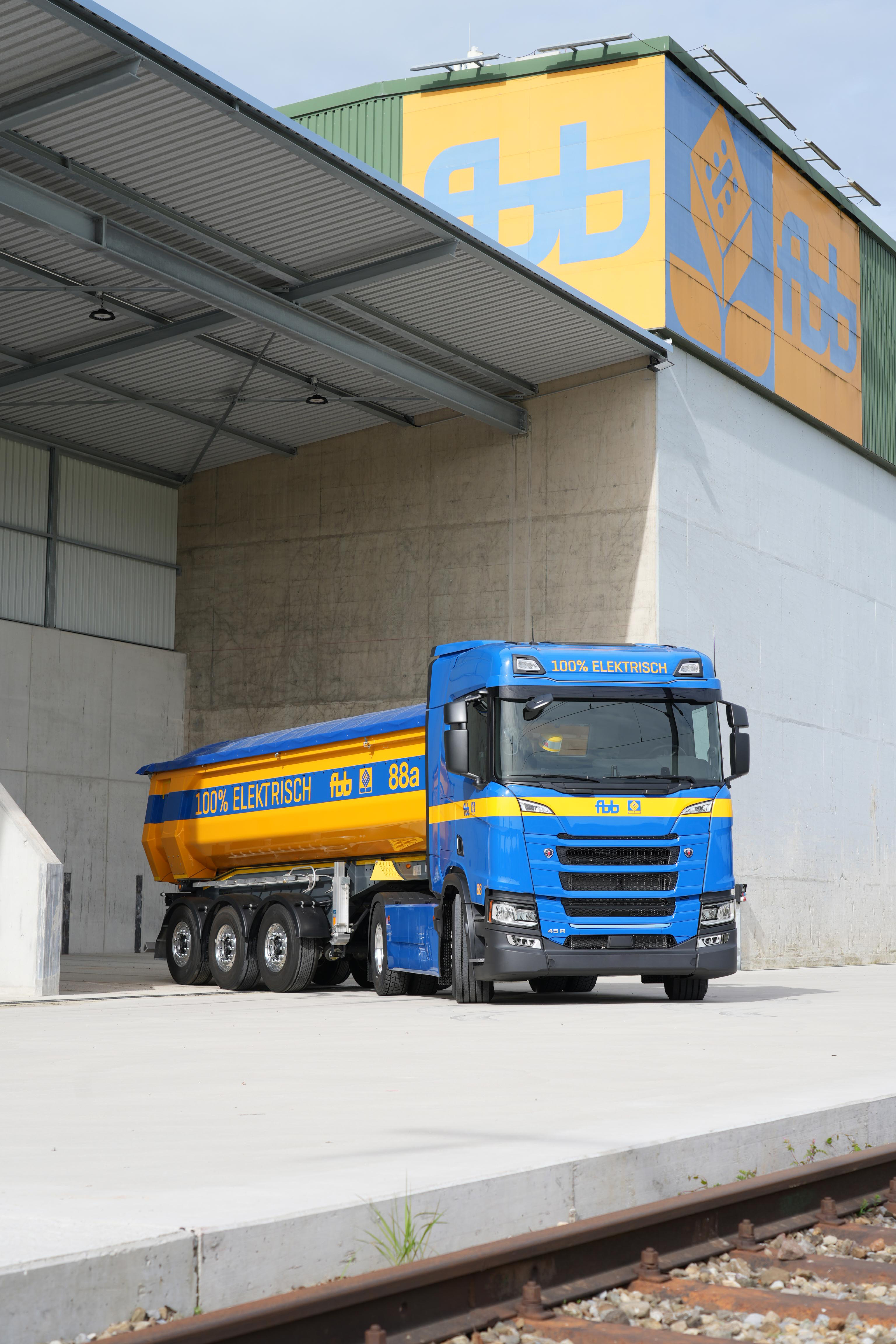 Um die Kette des emissionsarmen Baustofftransports zu schliessen, wurde die Evaluation von Elektro-Lastwagen in Angriff genommen. Als Scania im Frühling 2022 die Lancierung von elektrischen 42t-Zugmaschinen bekannt gab, entschloss man sich bei der FBB, gleich zwei dieser neuen Fahrzeuge zu bestellen. Zukünftig ist das Traditionsunternehmen in der Lage, den Kunden ein umweltfreundliches Transport-Gesamtkonzept anzubieten. Die beiden Scania BEV 45R A 4x2 NB kommen überwiegend auf befestigten Strassen zum Einsatz, wie z. B. für den Transport von Kies-Komponenten oder von Ausbau- und Neu-Asphalt.