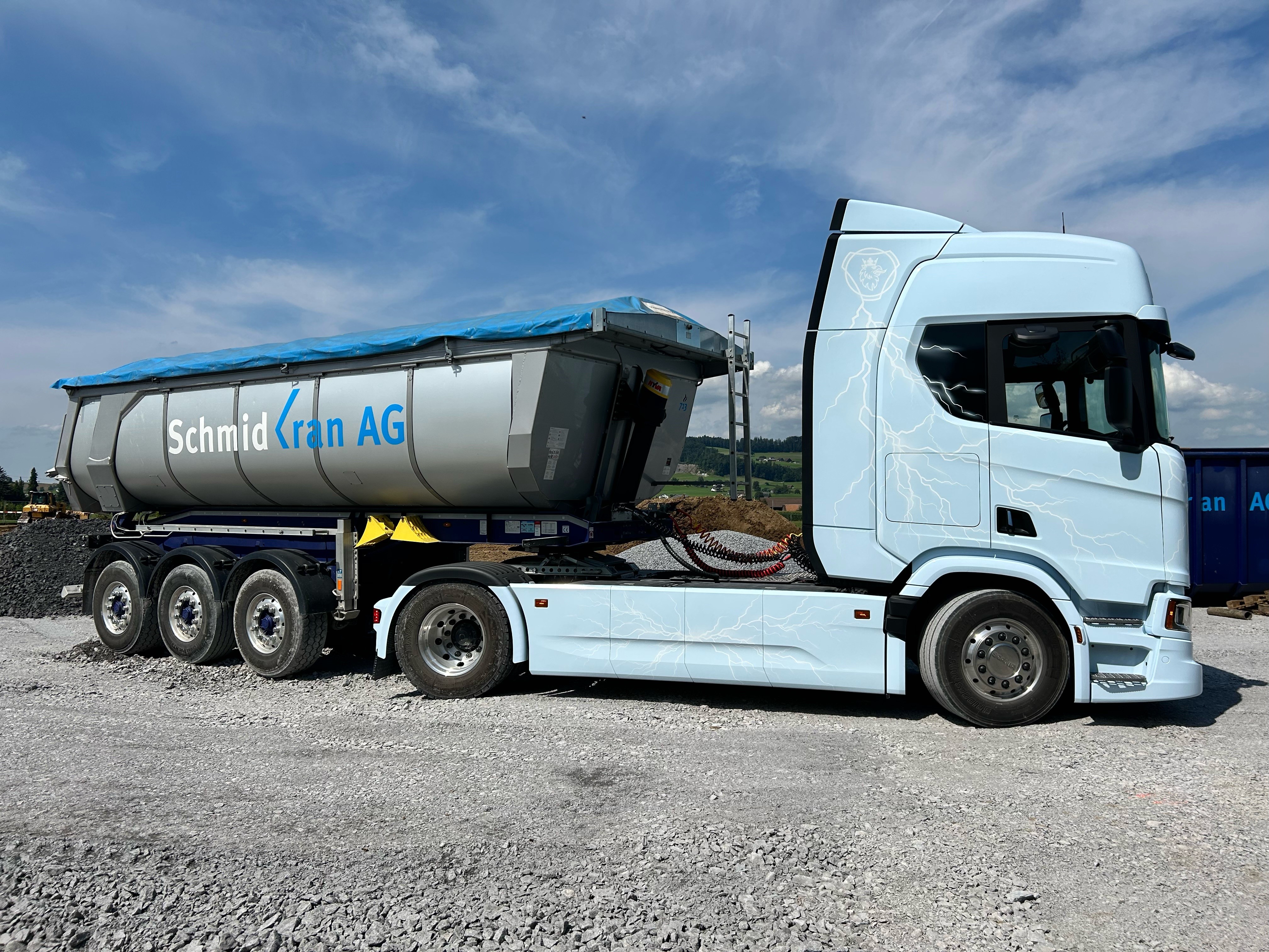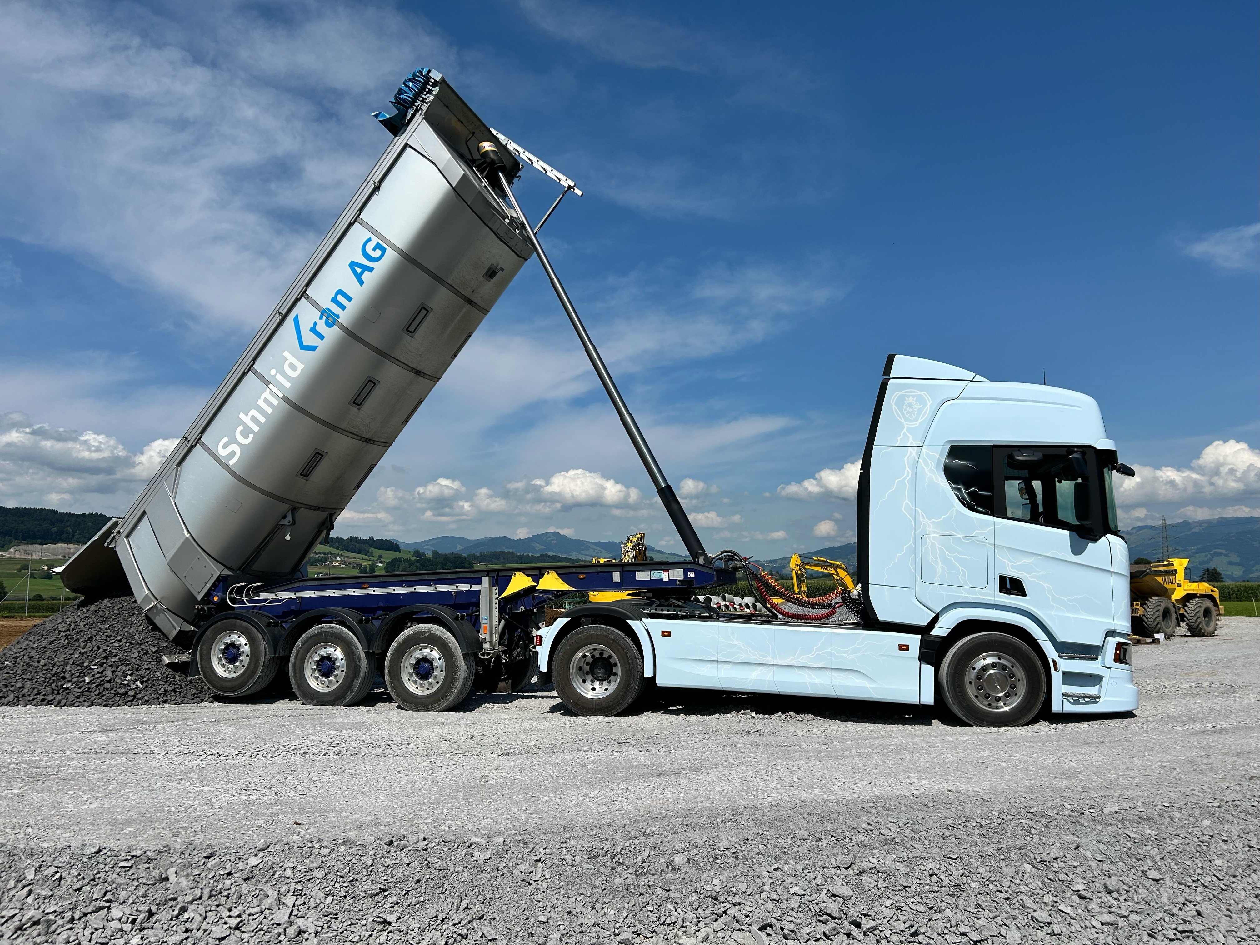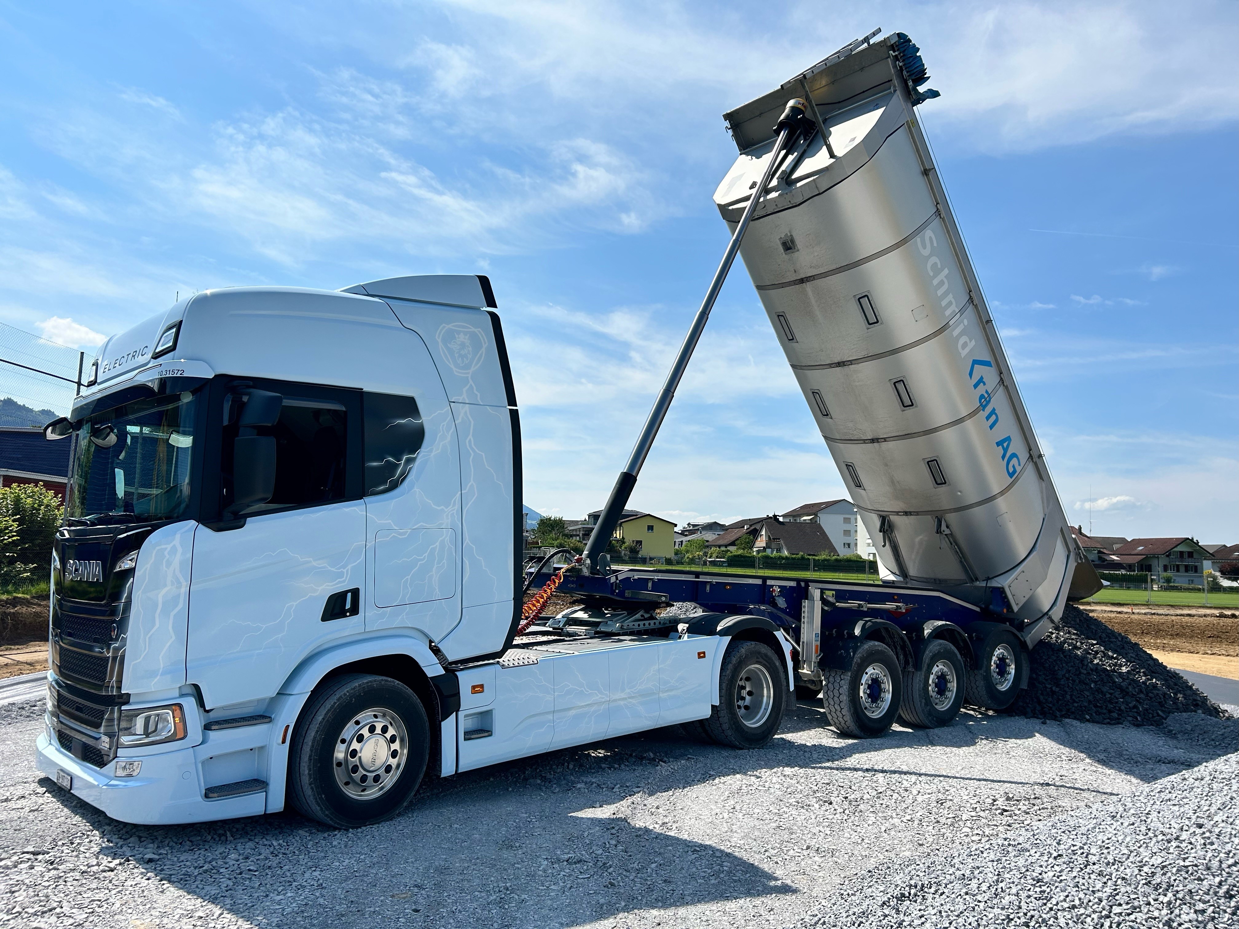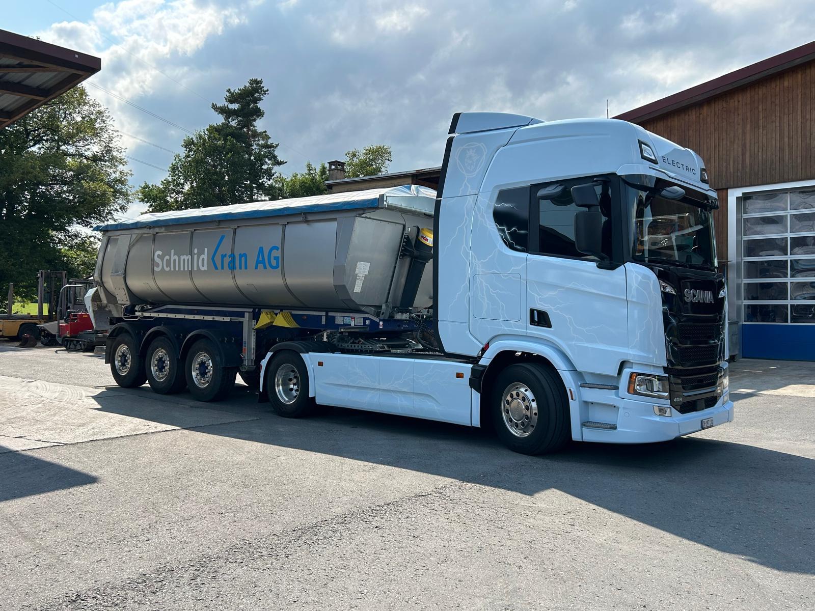 So auch bei der Schmid Kran AG in Grüningen, welche einen diversifizierten Fuhrpark betreibt und mit Ihren Fahrzeugen im Bau-, Kran- und Spezialtransport tätig ist. So stand man dem Angebot der Scania Schweiz AG gegenüber offen, die neue Scania BEV 40R A 4x2 NB Sattelzugmaschine in Kombination mit einem Kippauflieger zu testen, um auf all die offenen Fragen auch Antworten zu bekommen.