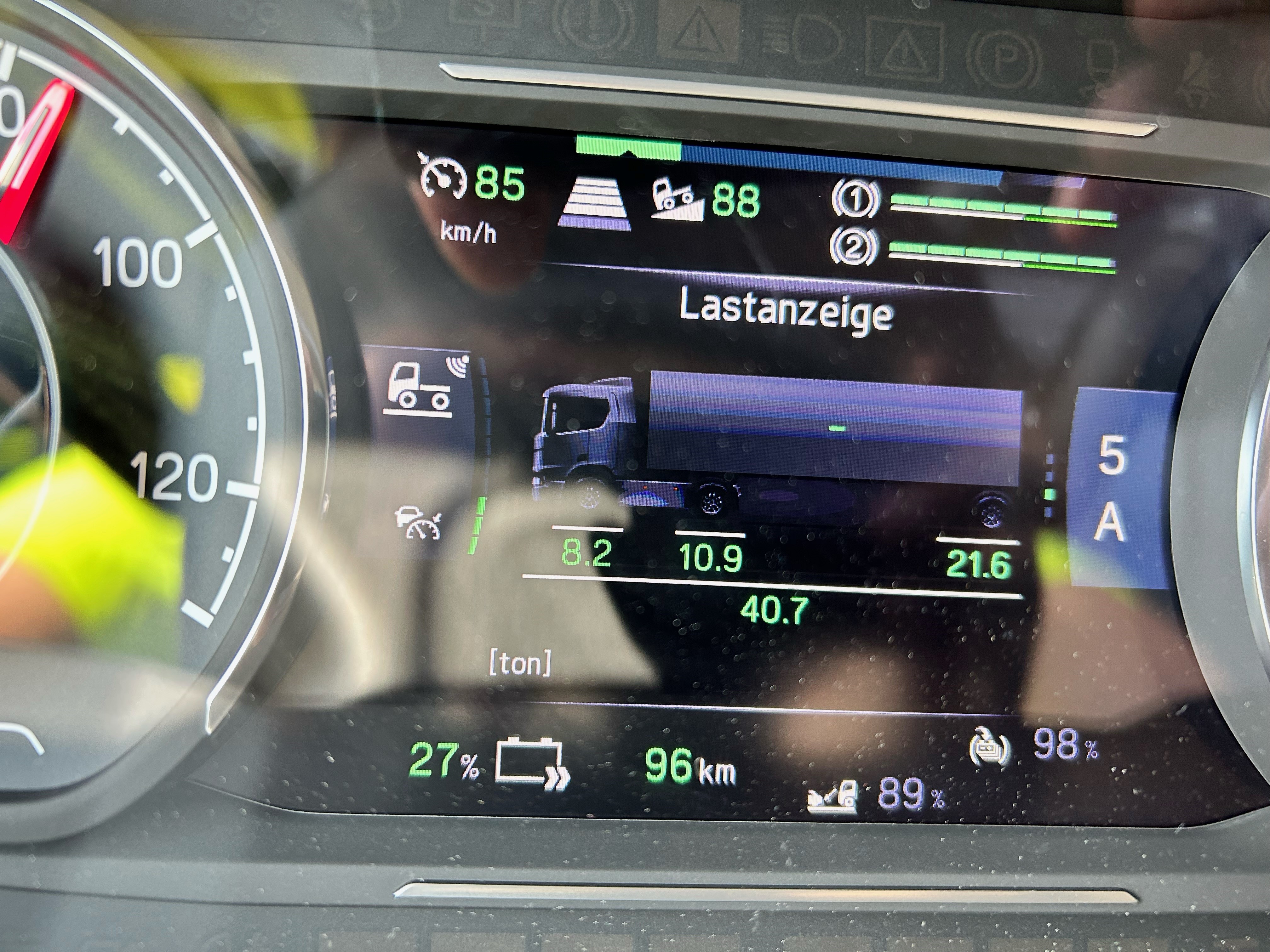 So wurde die BEV Sattelzugmaschine während zwei Tagen intensiven Praxistest unterzogen. Am ersten Tag wurden 339 km zurückgelegt und man ist mit einer Restladung von 18% nach Hause gekommen. Am zweiten Tag ging es dann sogar noch etwas weiter und nach einer Distanz von 354 km hatte man noch eine Restladung von 16%. Dies ergab einen Energiebedarf von 1.118 kW/h und am zweiten Tag 1.11 kW/h pro gefahrenen Kilometer, was hervorragende Werte bedeutet.
