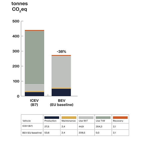 Wir bei Scania wollen den Transport in eine breitere, nachhaltige Perspektive stellen - denn wenn die Auswirkungen nicht durch Auspuffemissionen verursacht werden, müssen wir neu definieren, wie wir die Umweltbelastung betrachten. Aus diesem Grund haben wir als erster Lkw-Hersteller eine Ökobilanz für Verteiler-Lkw veröffentlicht. Der Bericht, der Lkw mit Verbrennungsmotoren mit Elektro-Lkw vergleicht, kommt zu dem Schluss, dass die Umweltauswirkungen von Elektro-Lkw von der Produktion bis zur Recovery Phase deutlich geringer sind.