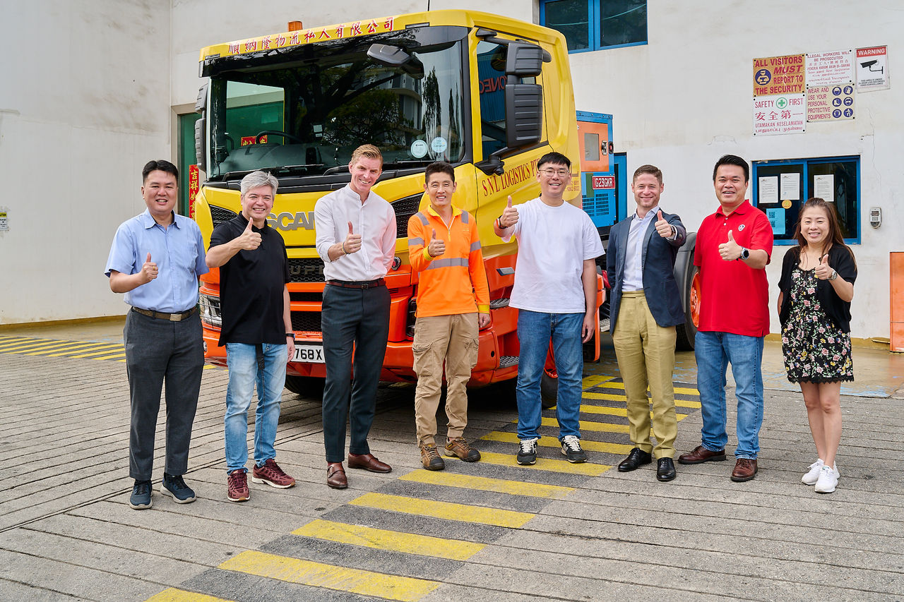 Seen here is Lilian Ngo, Service Sales Executive of Scania Singapore; Benedict Chan, Area Sales Manager of Scania Southeast Asia; Aron Lai, Solution Sales Executive of Scania Singapore; Johan Clason, Presales & Logistics and Export Markets Director of Scania Southeast Asia; Lim Jing He, Director of SNL Logistics Pte Ltd; Oscar Wyckman, Country Manager of Scania Singapore; Gary Chin, Solution Sales Director for Trucks of Scania Southeast Asia (left to right)